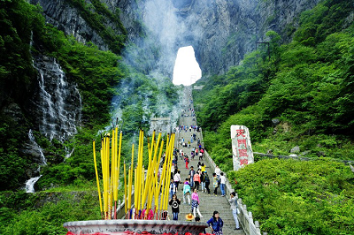 3.天门洞开:九百九十九级台阶登上天门洞,登天祈福。高131.5米,宽50余米,南北对开于千寻素壁之上,气势磅礴,巍峨高绝,是罕见的高海拔穿山溶洞,更是尽显造化神奇的冠世奇观,2006俄罗斯空军张家界天门山特技飞行表演让天门洞悬念升级,再次成为全球焦点。