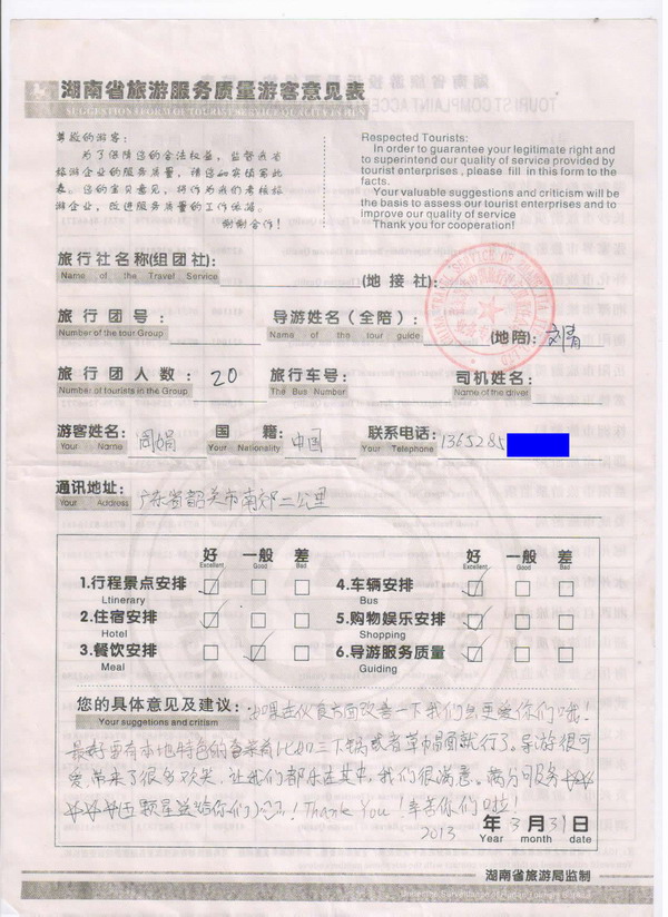 广东周小姐一行20人旅游质量回馈单