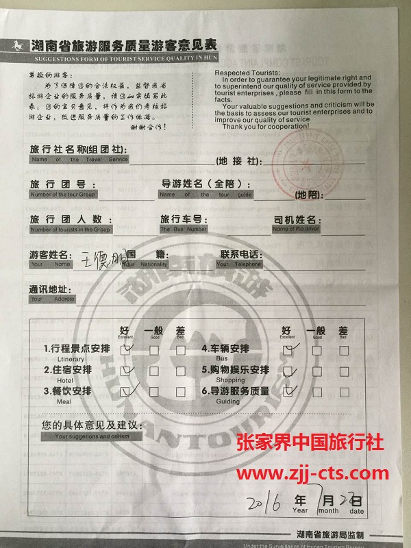 上海王德明一行4人旅游质量回馈单